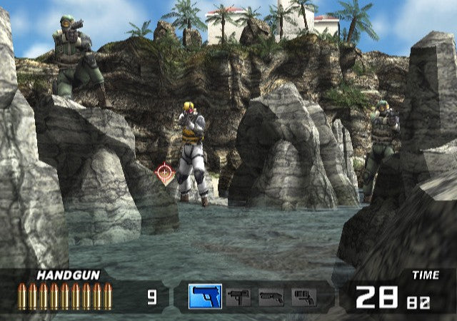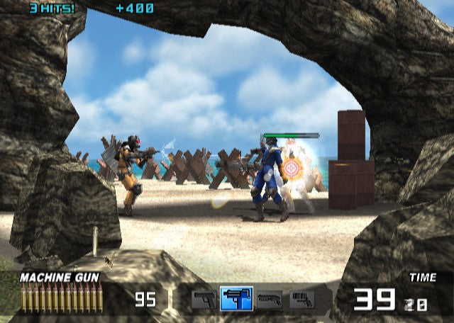 Blast through waves of enemies and take cover in the intense light-gun shooter Time Crisis 3 for the Playstation 2. This arcade conversion features the series' signature foot-pedal cover system (simulated on the controller or with compatible GunCon2 light gun) and introduces a new weapon-switching system, allowing you to choose between handgun, machine gun, shotgun, and grenade launcher. Battle terrorists across various action-packed stages, rescue hostages, and stop a global threat. With its fast-paced action and thrilling set pieces, Time Crisis 3 delivers an exhilarating arcade experience.
