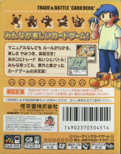 Become a master duelist in the deep and strategic Trade & Battle: Card Hero for the GameBoy Color. Developed by the minds behind Fire Emblem, this collectible card game offers a surprisingly complex and rewarding experience. You play as a young hero who must collect, trade, and battle with monster cards. The innovative gameplay requires two monster cards to act and a magic card to power them, creating a deep layer of strategy. Build your ultimate deck, challenge a wide variety of opponents, and prove you are the one true Card Hero.