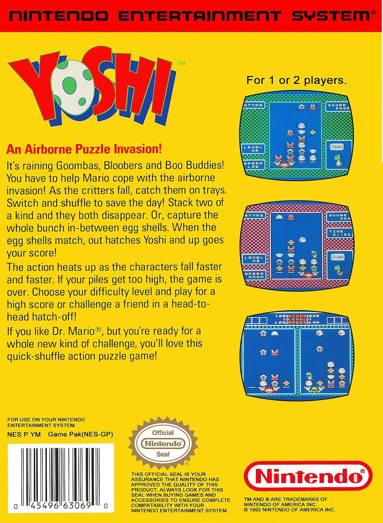 Get ready for fast-paced puzzle fun with Yoshi for the NES. Mario needs your help to clear the screen of falling monsters! Match iconic Nintendo characters and enemy blocks by swapping trays at the bottom of the screen. Sandwich monsters between two eggshell halves to hatch a Yoshi and score big points. This addictive action-puzzle game offers simple yet compelling gameplay that will keep you coming back for more.