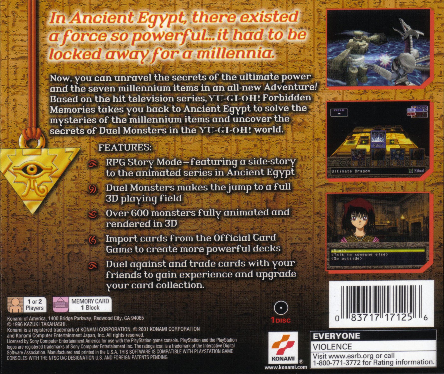 Relive the earliest duels in Yu-Gi-Oh! Forbidden Memories for the Playstation. Journey back to ancient Egypt and participate in high-stakes shadow games. Collect hundreds of cards, many of which are unique to this title or feature different mechanics, and engage in a simplified, yet challenging, version of the card game. Unravel a mystical storyline and duel against iconic characters in this classic and often notoriously difficult PS1 dueling adventure.